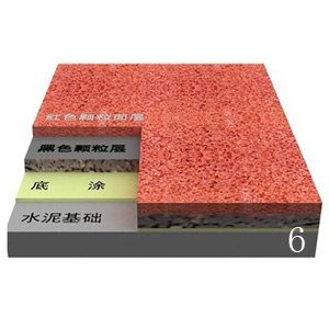 3、面层采用EPDM(三元乙丙)橡胶胶粒是与聚氨酯浆料、预聚体混合搅拌后,采用机械喷涂进行施工不会掉粒,具有高度紫外线抵抗力,无褪色;