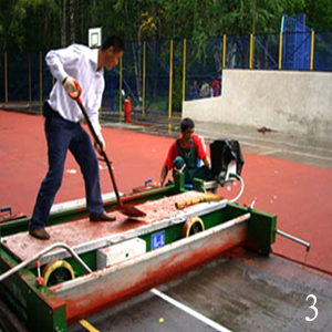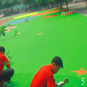6) 一定要严格按照比例进行配料。视颗粒情况而定,好的用胶水少,差的用胶水多;大的用量少,小的用量多。底层橡胶颗粒:胶水=6-8:1;面层EPDM颗粒:胶水=5-6:1,催化剂一般不需要加,如环境温度低于10℃时,可适当加入5-10‰。