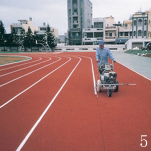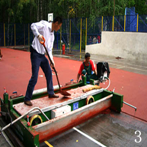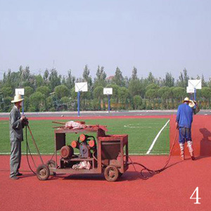 4、全场倒入2mm厚跑道面层材料,刮耙刮平,全场均匀撒下3-5mmEPDM防滑颗粒,24小时后清扫掉未粘牢的EPDM颗粒,之后滚涂或喷涂一层跑道专用面漆。