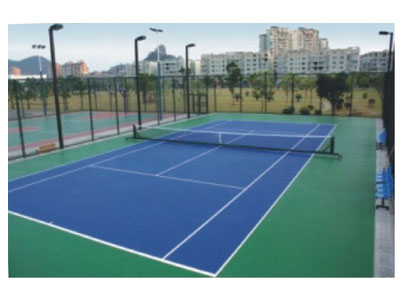 5、硅PU网球场弹性找平层施工:待弹性层材料干固后,须及时施工加强层材料,能确保两层材料结牢固;材料在施工前必须要按配比用搅拌机搅拌均匀才可使用。已配好的材料必须在30分钟内用完;干固后表面要求平整光滑,若在施工过程中混入杂物或不平处需修整平滑才能进行下一道工序,施工方法同弹性层一样。
