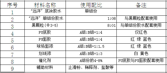 1、将球场面漆按配比称重,加适量止滑粉,搅拌均匀后滚涂于PU表面上。